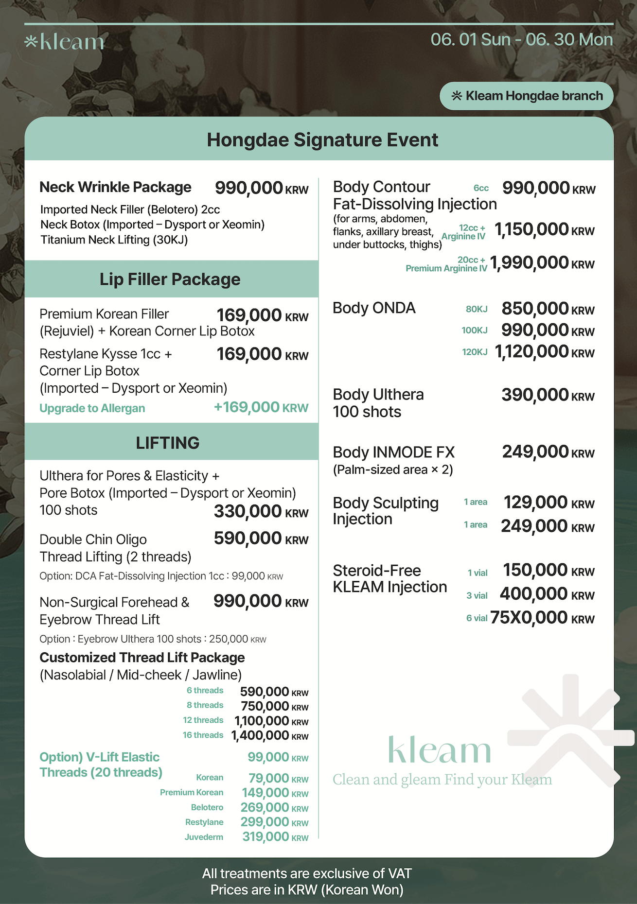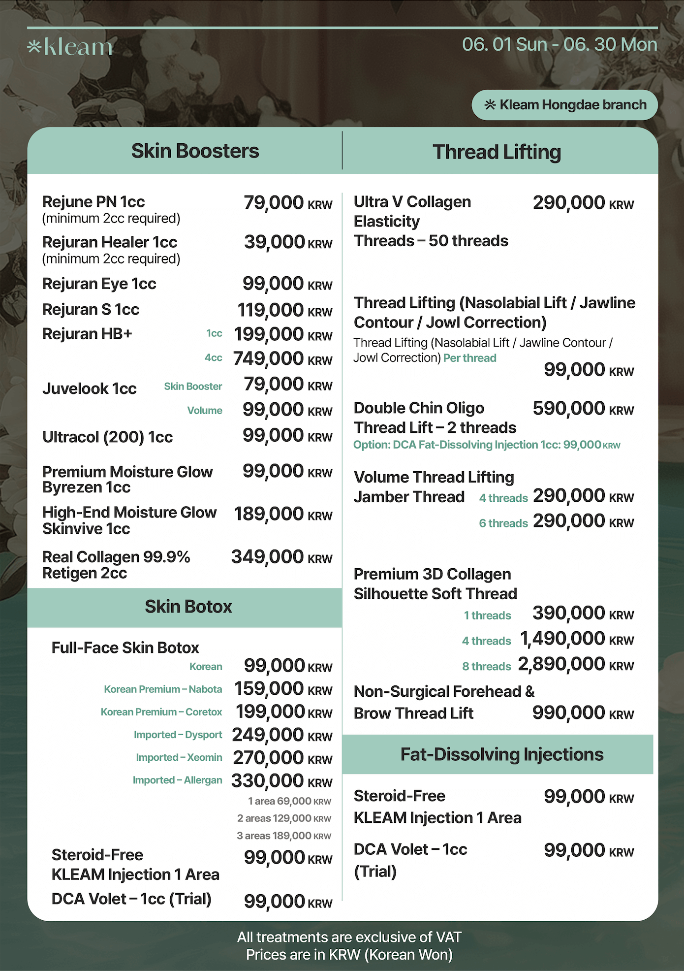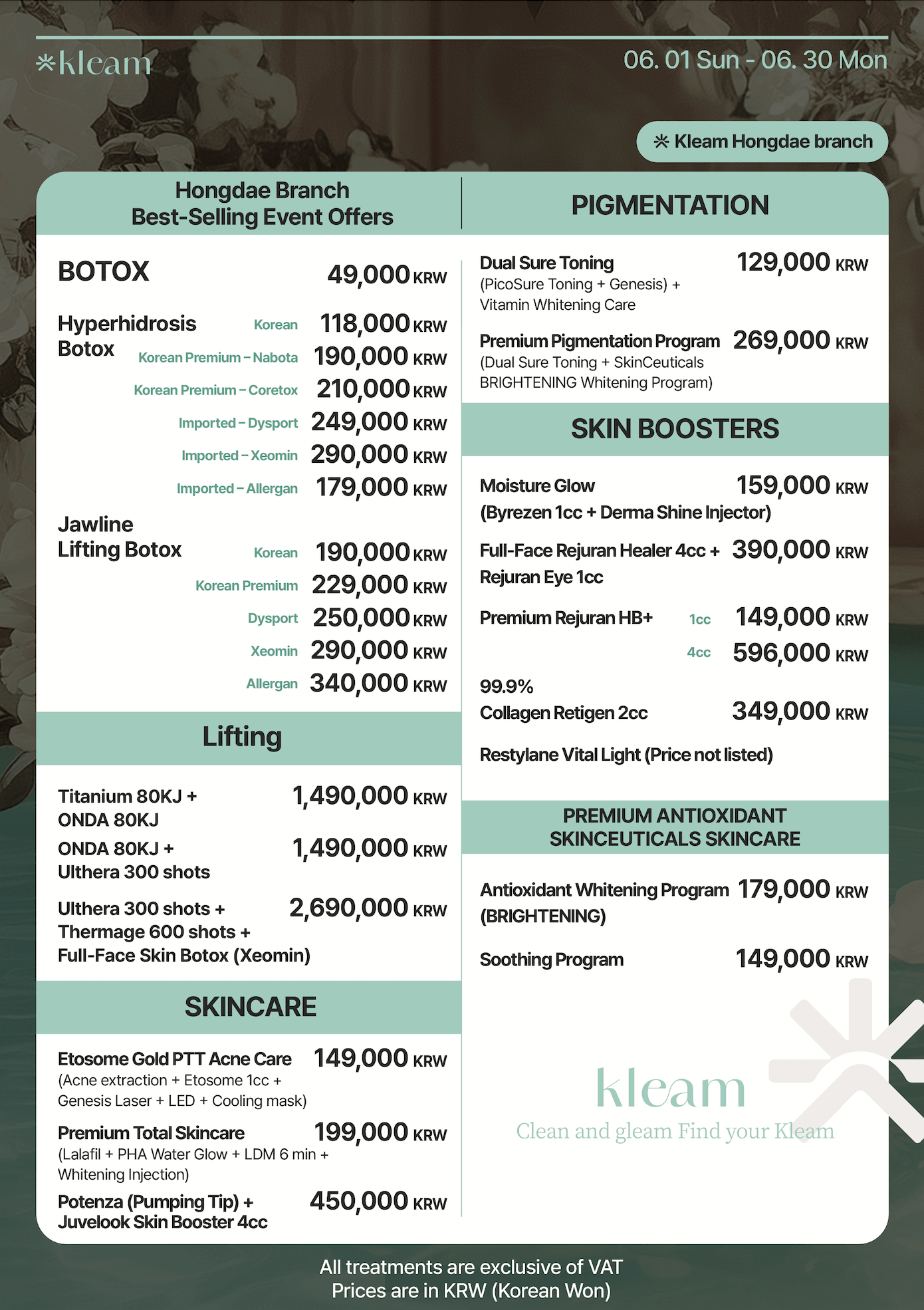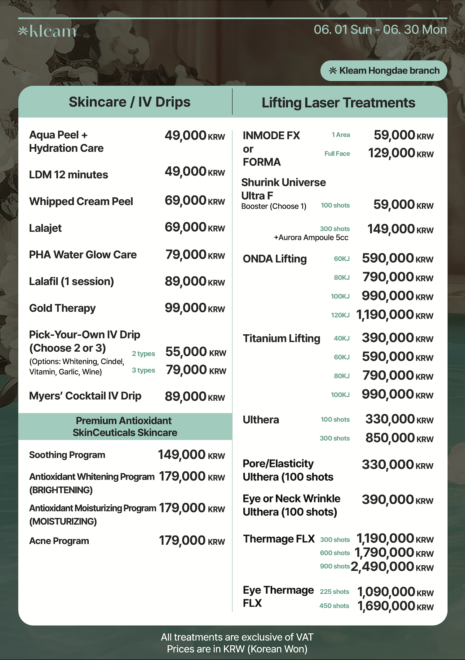 Erschwingliche und transparente Preise in der Kleam Clinic Hongdae